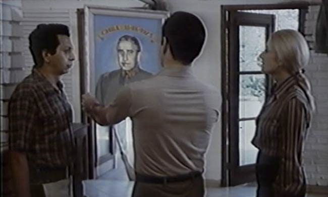 Todos temen al personaje de Villagra, víctimas y victimarios. Sus primeras apariciones son más bien secundarias. Camina, da órdenes y observa lo que pasa en esta casa que funciona como centro de torturas. Antes de conocerlo en su función, lo vemos amenamente en una escena bastante sarcástica, en que uno de sus pupilos le regala un cuadro en que ha pintado a Pinochet. “El Jefe” felicita al hombre, mira el retrato con admiración y se lo lleva a su oficina. Los tintes irónicos no cesan allí, siguen durante el resto de la película, la mayoría del tiempo en relación a los prisioneros. Así es como en algún momento el personaje de Villagra dice que hay que dejar en libertad a una de las víctimas, que está embarazada, ya que si no lo hacen, hasta el Papa va a reclamar.