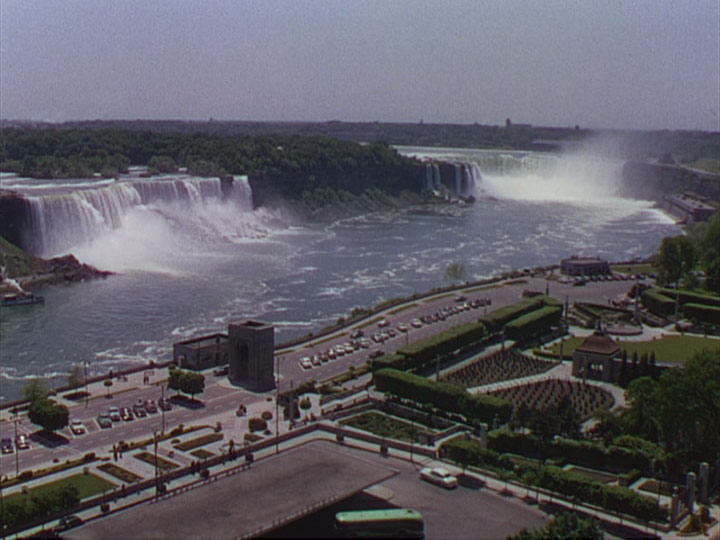 Del director Henry Hathaway, veterano del Western protagonizado por John Wayne (True Grit, How the west was won, The sons of Katie Elder), el cine negro (Kiss of Death, The Dark Corner, The House on 92nd Street), Niágara: Torrente Pasional es la excelente oportunidad de ver un film noir en un ambiente atípico –casi burdo, turístico- donde la atmósfera está dada en partes por el agua en suspensión, el ruido de las cataratas, los largos impermeables amarillos y negros que ocultan identidades y un reconocible sonido de campanas en la lejanía: una canción (Kiss, 1953) que nuestra malvada protagonista reconoce. Frente a su marido, horas antes en una fiesta por la noche frente a la cabaña, Monroe se la canta a sensualmente a un hombre ausente: “Won’t you kiss me?...thrill me, thrill me, take me…”. Desde el interior de la cabaña, su esposo la mira y escucha furioso, detrás de una persiana que lo enreja. El ingenuo de Ray Cutler le pregunta a Monroe: “You kinda like that song, don’t you Miss Loomis?”, ella responde rápida y directa: “There isn’t other song”. ¿Te quedó claro Ray?.