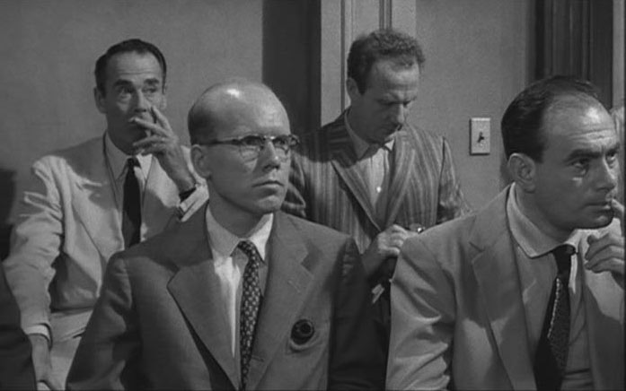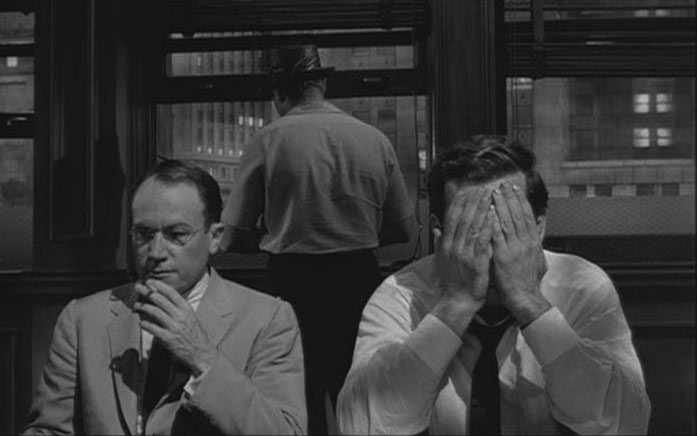 Once hombre entran una tarde a la habitación listos para terminar con el trámite, votar “culpable” e irse a la casa rápidamente, a ver un partido de béisbol o a donde quiera que vayan, y freír en la silla eléctrica al chico. Pero el jurado #8 (Henry Fonda, un Arquitecto pronto sabemos) se opone de inmediato. “Not Guilty”. ¿Qué? ¡Pero si es evidentemente culpable, todas las pruebas lo condenan!. Fonda no sabe si el acusado es culpable o es inocente, como él mismo dice, pero tiene una duda razonable. Esto es más que suficiente. Si quieren salir de la habitación con un veredicto unánime –pues estas son las condiciones dadas por el juez- once hombres deben convencer a uno de su error o uno a los once y hacerlos cambiar su voto a “inocente”. Sólo tienen hasta las siete de la tarde, el calor aumenta, el ventilador no funciona, los diálogos suben de volumen, los hombres se enfrentarán en dos bandos. El denso aire se puede cortar con motosierra, ¿ya sientes la tensión?.