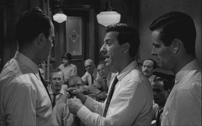 La historia, el lugar, los personajes y el único tiempo y espacio donde transcurre esta película (12 Angry Men) del gran director Sidney Lumet (Serpico, Network, Tarde de Perros, Piel de Serpiente, ¿necesitas que mencione otro clásico?) está más que clara: un jurado compuesto por 12 hombres que nunca se han visto en su vida y que desconocen sus nombres –como dicta la ley en EE.UU- son encerrados en una pequeña habitación en el día más caluroso del año para dar su veredicto en un caso que han seguido casi por una semana. La habitación sólo tiene la puerta de acceso (cerrada con llave), una gran mesa en su centro con doce sillas, un pequeño ventilador y algunas ventanas que miran a la ciudad desde lo alto del edificio en el que están, un bidón de agua con algunos vasos y una puerta que da a un baño básico. El caso en cuestión: un joven de 18 años, con antecedentes delictuales, y con varios testimonios en su contra, es acusado de asesinar a su padre clavándole fríamente una navaja en el pecho.