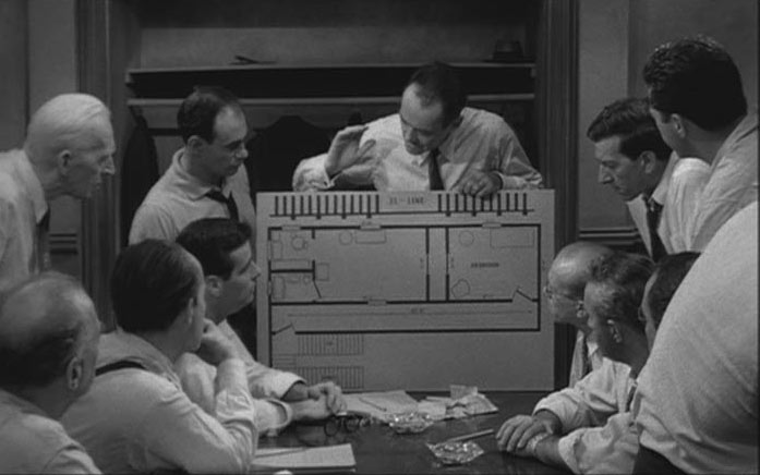 El arquitecto trata de convencer a los otros once con una planta del uno de los departamentos del edificio del crimen.