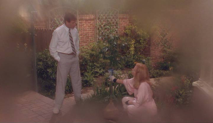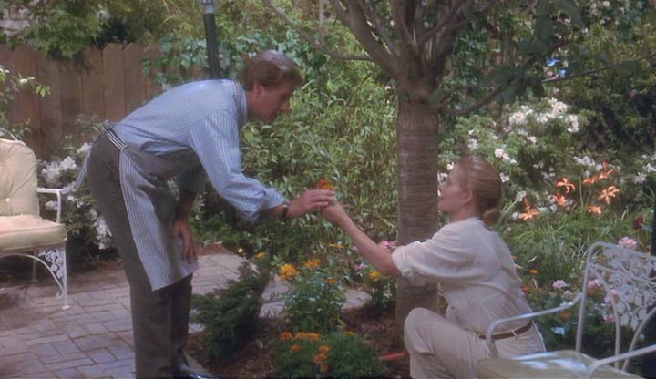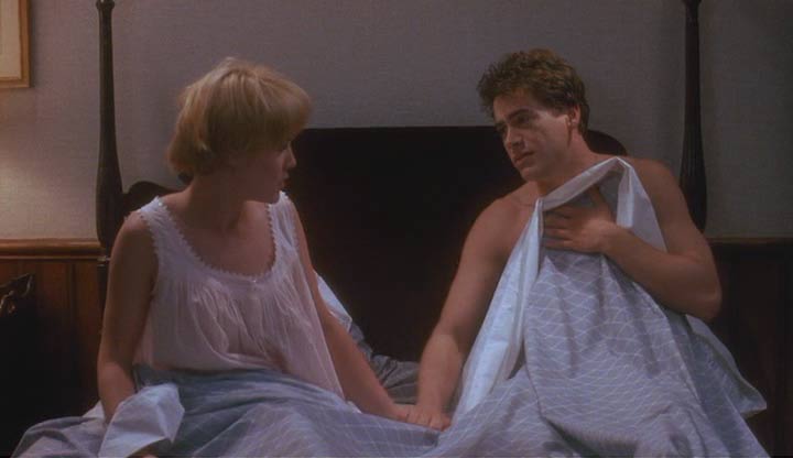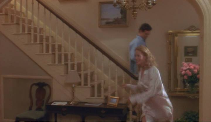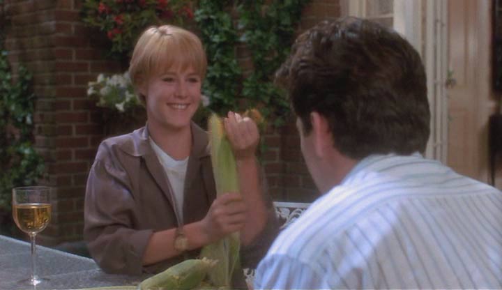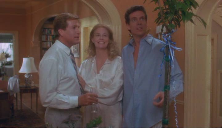 La madre de Miranda llega a la casa, que resulta ser la ya mencionada Corinne, y comienza la mejor escena de la película; de pronto Alex cree que se está volviendo loco, viendo en su cabeza a la viuda, ahora veinte años menor, en unos flashbacks de estética tipo softcore: esos sueños llenos de brillos y desenfoques ocasionales, sin contraste y con una imagen casi bañada en leche, ojalá con bordes blancos. Se da cuenta que conoce perfectamente la casa y cada una de las cosas en ella, recupera la memoria y reconoce ser la reencarnación de Louie. Con el enamoramiento de la muy directa Miranda hacia él (que en rigor es su hija, bueno en alma al menos), se producen unas de las tantas escenas incómodas que mueven a esta comedia de cambios de cuerpo, un tema tan repetido como paradigmático del cine de los ochentas.