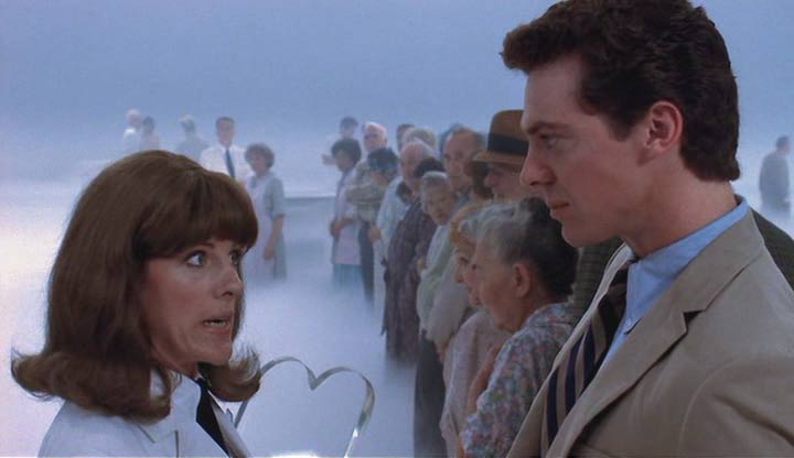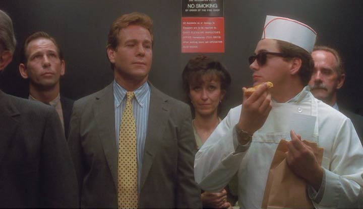 Este es un cielo lleno de hielo seco, chaquetas blancas, colas de recientemente fallecidos (ni en el cielo nos salvamos de hacer cola, maldición) y resplandores blanquecinos. Apurado por volver, un incompetente ángel olvida colocarle una importante inyección en el brazo y regresa al alma de Louie a la Tierra sin este trámite. Veinte años después, un también veintiañero Alex Finch (Robert Downey Jr.) está flirteando en una biblioteca con la guapa Miranda (Mary Stuart Masterson, la chica pseudo lesbiana de Tomates Verdes Fritos). A los pocos minutos de la película y en una extraña coincidencia, Alex conoce de paso a quien se comporta como el padre adoptivo de la chica de la biblioteca, el señor Philip Train (Ryan O’Neal, otrora galán juvenil y al borde de una depresión de las grandes en “Love Story” en 1970) y termina invitado a cenar en la casa de la chica que le gusta.