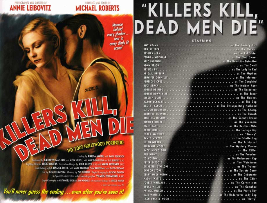 Titulada «Killers kill, dead men die» (Los asesinos matan, los hombres muertos mueren), esta superproducción fotográfica que hace referencia a decenas de títulos del género de las armas humeantes y las traiciones, fue creada como parte de una historia original (que me he permitido traducir del inglés al español en este sitio, de la forma más fiel que me fue posible) que hila las fotografías, y convierte así a esta sesión de imágenes en verdaderos fragmentos de una película, en parte de una historia mayor. Asistida por el gran cinematógrafo Vilmos Zsigmond (Encuentros Cercanos del tercer tipo), director de fotografía que ha participado en cine Neo-Noir como «La Dahlia Negra» (2006) de Brian de Palma, este es el brillante (¿o debería decir oscuro?) resultado de la cámara de Leibovitz.