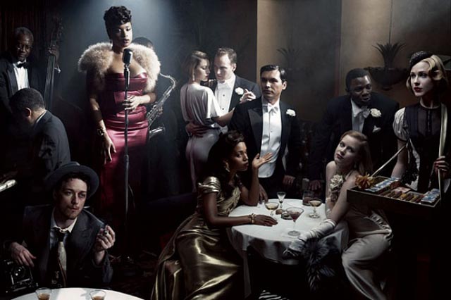 ¿Quién dice que el dinero no compra la felicidad? Ciertamente lo hace cuando un cocktail en este establecimiento cuesta bastante más que tres grandes almejas. La sentimental cantante June Holliday (Jennifer Hudson) entibia sus cuerdas vocales con “My Man (Is No Longer Around)” para una habitación llena de elegantes miembros de Toluka Lake (de izquierda a derecha: Jessica Biel, Patrick Wilson, Kerry Washington, Adam Beach, Amy Adams, and Derek Luke), niguno de los cuales tiene un motivo para sacrificar a Oscar Slade, lo que precisamente los hace sospechosos. El único que parece no estar disfrutando la velada es el fotógrafo de Confidential Sam Brady (James McAvoy). Sin embargo, mientras el fotógrafo se revuelve en su miseria, eso significa que está contento en su particular manera. ¿Es la chica de los cigarrillos (Evan Rachel Wood) realmente una chica de los cigarrillos? ¿son sus intenciones tan oscuras como sus chocolates?
