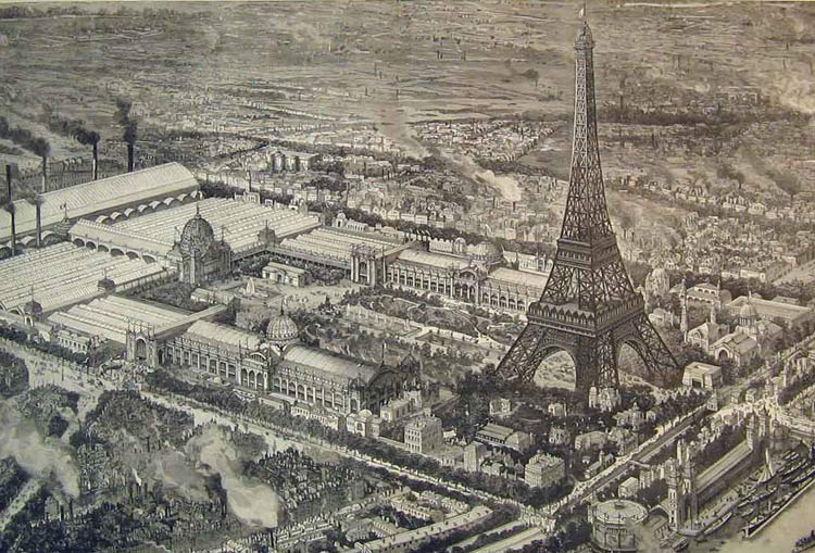 Dibujo aéreo de la Exposición Universal de 1889, con la Torre a la entrada.