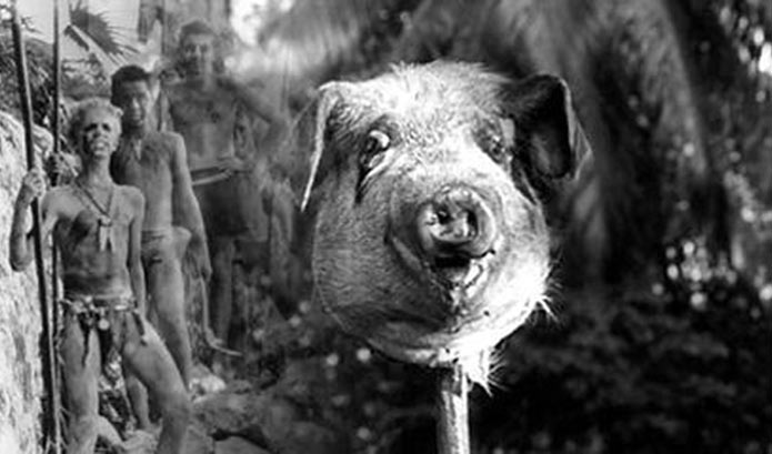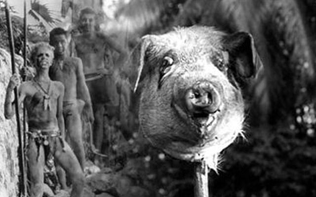 Los jabalíes son el sustento principal de alimento y a la vez, su cacería nos demuestra el poder que adquiere el grupo más salvaje. Esto se ve representado cuando la cabeza de unos de los cerdos es cortada y clavada en un palo rindiéndole honores al monstruo que no existe. Esta ofrenda entregada a la bestia no es más que la representación física de los temores existentes a lo desconocido, se le rinde un culto a lo que más tememos, y paradójicamente aquí Simon vuelve a resonar con su gran frase diciendo que no hay bestia, solo somos nosotros. Esta cabeza también viene a representar la ley del más fuerte y dentro de su reproducción divina, se puede comparar con los faraones egipcios y la utilización de esfinges y otros métodos similares de representación del poder, en este caso, la cabeza o esfinge del cerdo es el centro de la ofrenda divina a algún ser superior que se teme y respeta. Esto va de la mano con otro suceso relevante que está ligado al triunfo de este progreso a la inversa, que es la muerte de Piggy, otro asesinato que está totalmente justificado afirmando aun más la tesis que se plantea en el relato, ya que la triada de personajes es un símbolo de ciertos elementos que solo llegamos a descifrar en una vida adulta.