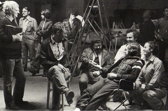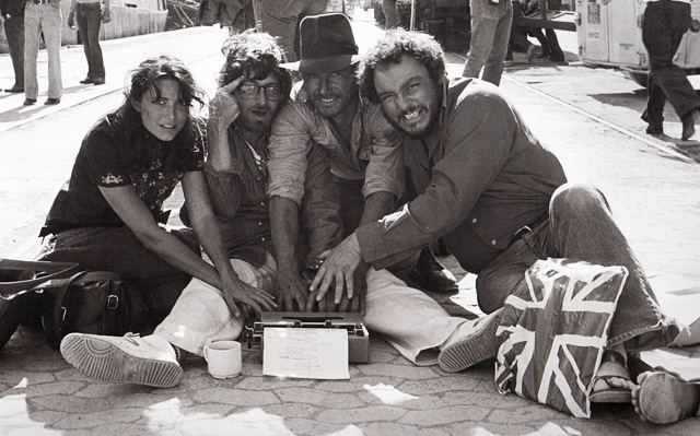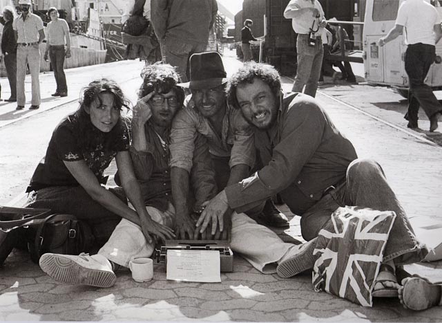 Robert Watts, Harrison Ford, George Lucas, Howard Kazanjian, Steven Spielberg y Frank Marshall se relajan un momento en Elstree Studios, Londres.