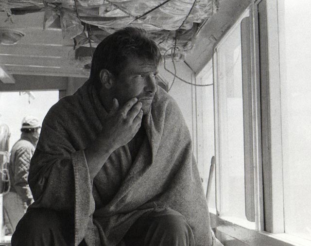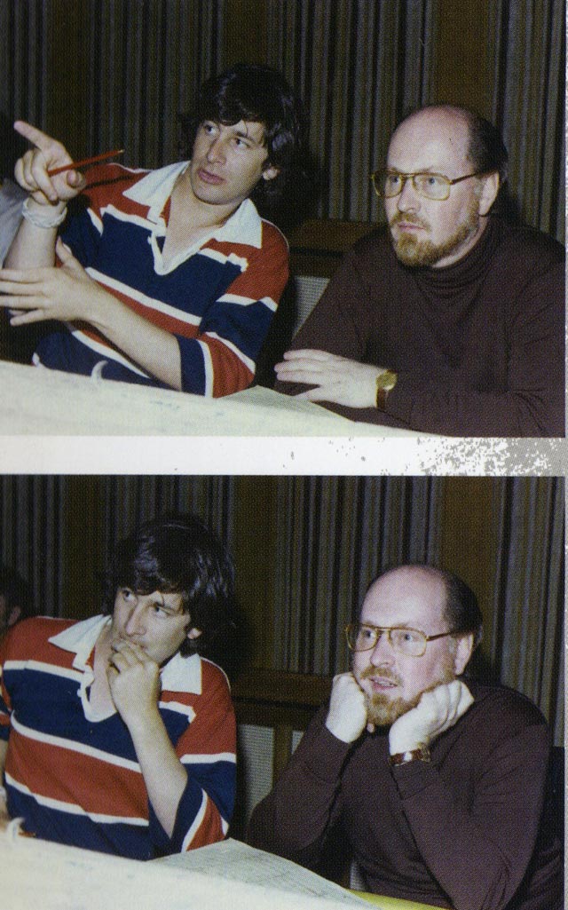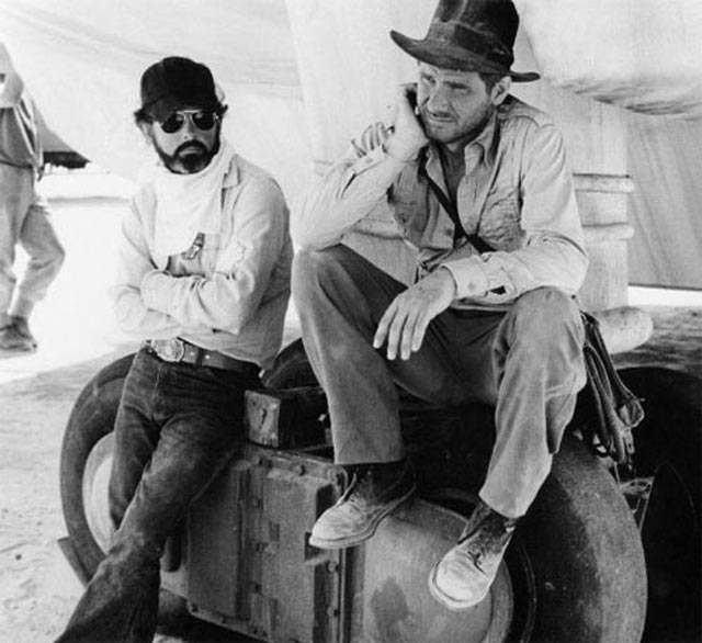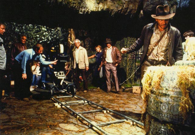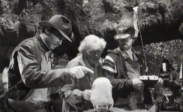 El ídolo caerá…Harrison Ford, el director de fotografía Douglas Slocombe y Steven Spielberg con los controles.