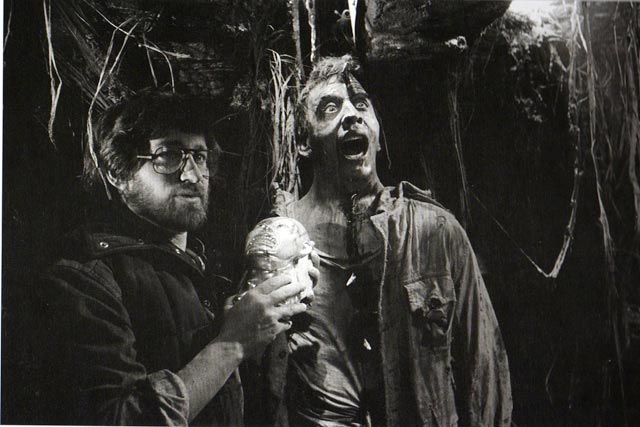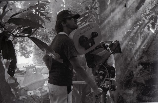 Si no sale el sol, invéntalo. Spielberg revisa las luces colocadas sobre los árboles para la secuencia de introducción de Jones en la selva.