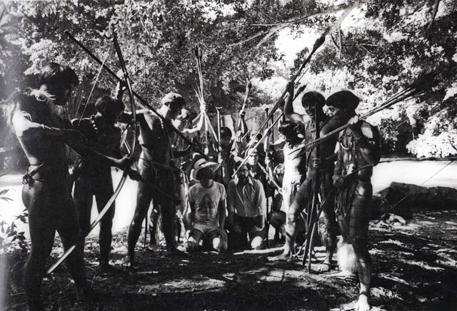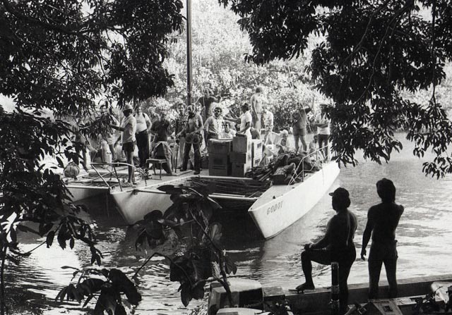 El equipo de producción llega a la locación en la selva a través del rio, en un catamarán.