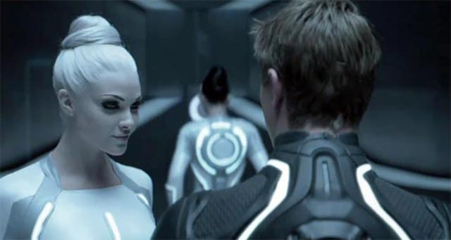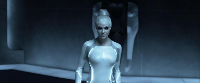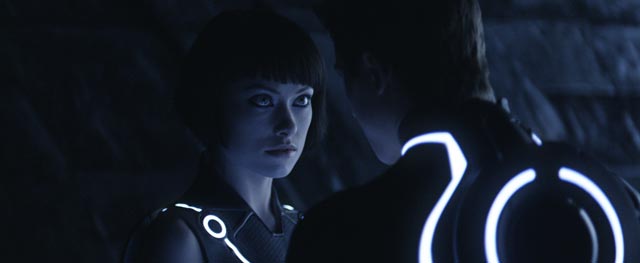 Me encontraba un poco perdido observando los fantásticos espacios que rodeaban a estos personajes, de los que salen diálogos apenas básicos que mueven la simple trama y a la que en un punto me resigné a pedirle mucho (la lógica es lo de menos, hay tantas preguntas que mejor ni me meto ahí), sin más que hacer que abandonarme a la próxima escena de placer cinético como las motocicletas o las naves voladoras. Cuando de pronto el personaje del que menos tenía expectativas, empezó a tomar un pequeño peso emocional del que nadie parecía querer hacerse cargo antes. Porque por suerte en Tron: Legacy existe Quorra (Olivia Wilde), un programa con forma humanoide –al igual que Clu y todos los otros personajes que se mueven en este mundo de chicos y chicas guapas en trajes de cuero apretados, luces de neon, frisbees destructivos, cascos de moto y el ambiente techno-cool-punk- que es la hija adoptada de Kevin en la virtualidad. Humanizada por su creador, padre y maestro, Quorra además de ser un programa especial, es más humana e interesante que el propio protagonista, el niño mimado que juega a ser adulto, o su propio padre, que en general es tan ausente. Extraño, por decir lo menos, que la representacion corpórea de un software sea quien conlleve mas peso emocional en varias de las escenas que los únicos dos humanos en el mundo de Tron y por extensión el largometraje.