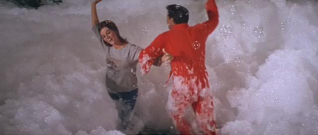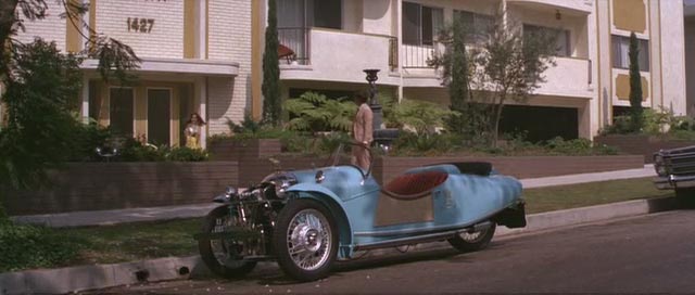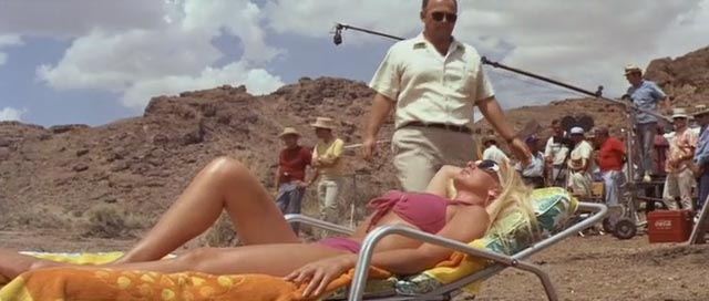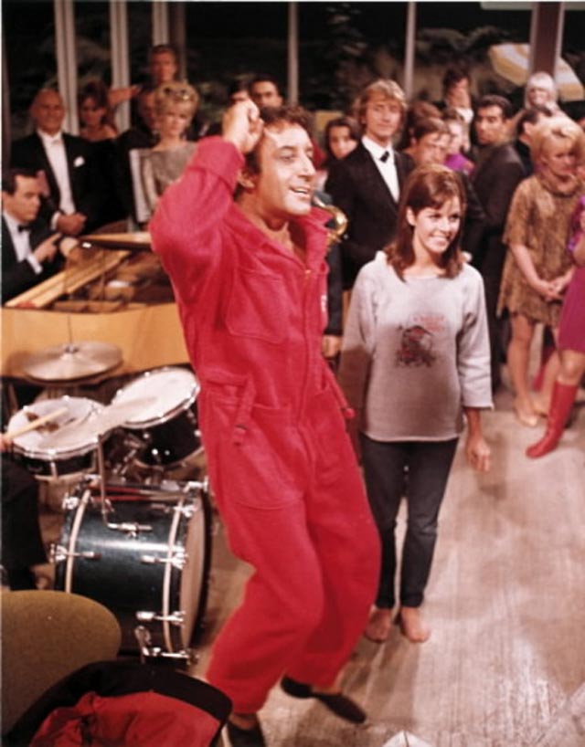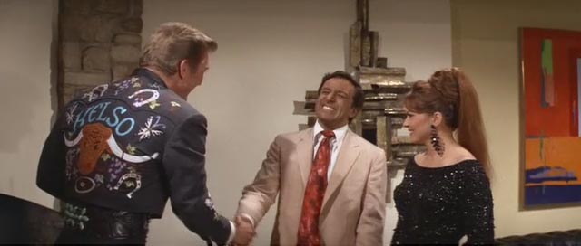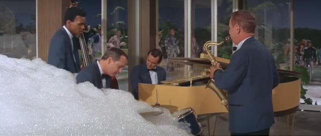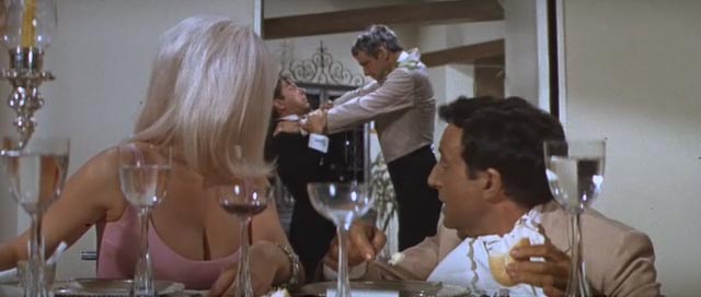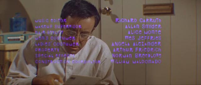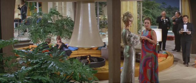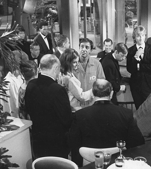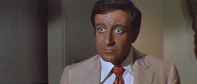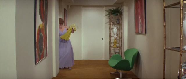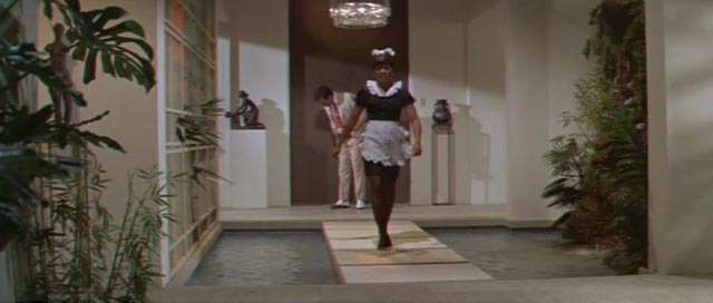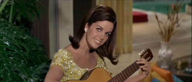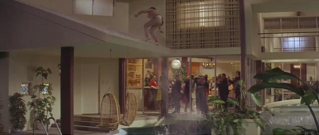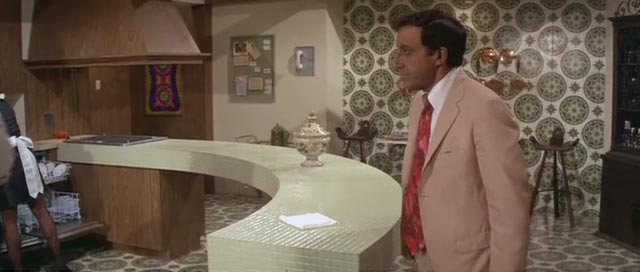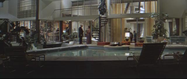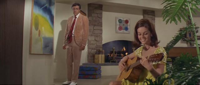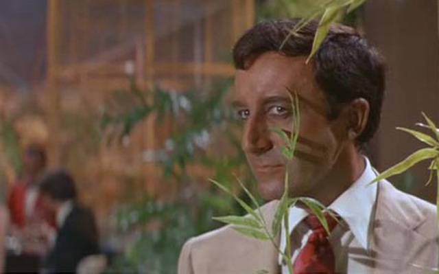 La cuarta locación que acompaña los créditos –con probablemente la tipografía más hippie de la historia impresa sobre la imagen, junto con las exageraciones contemporáneas de Austin Powers, inspiradas en esta secuencia – es una pequeña habitación donde el desempleado Bakshi toca tranquilamente una citara, hasta que vemos caer detrás de él, por la apertura de la puerta, el sobre con la invitación a la fiesta en la casa del jefe del estudio que Bakshi esta arruinando. Entramos ahora en modo A Go-Go en el soundtrack, con la segunda parte de los créditos y llegamos rápidamente al exterior de la quinta locación, el acceso de la vivienda de los Clutterbuck, el lugar de la fiesta. La música da paso al tema principal de Henry Mancini y no saldremos del interior de la vivienda, la sexta y más importante locación, en realidad un elaborado set, hasta el final de la película con la séptima y última locación. Este último momento de la película ocurre en un amanecer a las afueras de un edificio de departamentos donde Bakshi se despide de Michele Monet (Claudine Longet), la bella chica con la que compartió una fiesta realmente inolvidable.
