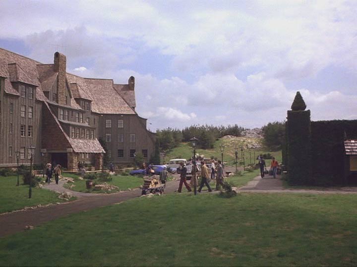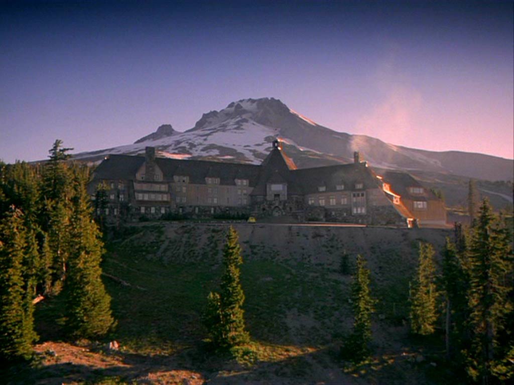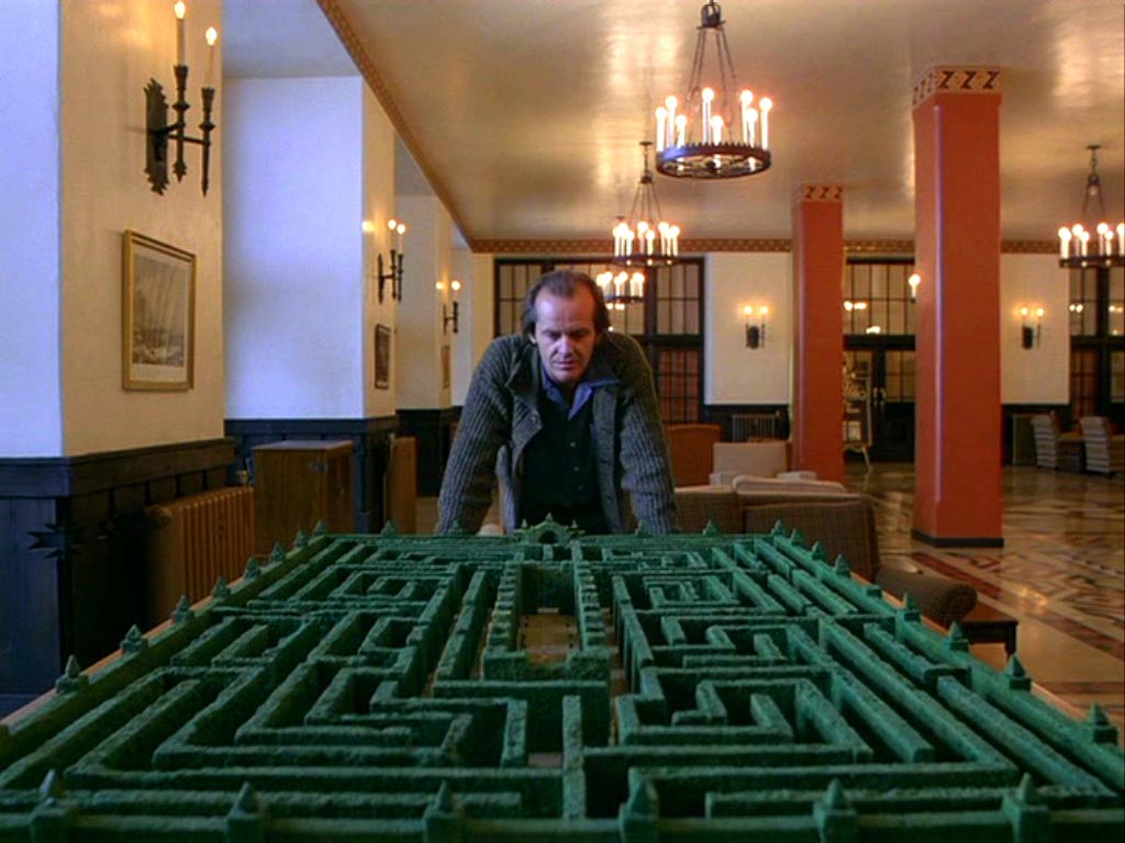Kubrick sabe, como Hitchcock en Psicosis (1960) o La Ventana Indiscreta (1954), que El Hotel Overlook debe ser un espacio con una doble cualidad. Tanto tangible y comprensible, como al mismo tiempo laberíntico y confuso. Sin embargo, y a diferencia de estos dos espacios del director inglés, el Overlook es un interior gigantesco contenido en un espacio exterior casi infinito. El Hotel se nos presenta desde el inicio alejado absolutamente de todos y todo, conectado por un delgado y serpenteante camino con el mundo. Rodeado de lagos, bosques y cerros donde la naturaleza opaca cualquier signo de humanidad. Overlook es una cáscara gigantesca, un laberinto con forma de edificio que se sostiene, antiguo y erguido, anexo a otro laberinto: uno vegetal. Dos interiores complejos que dialogan frente a frente rodeados de nada y de nadie.