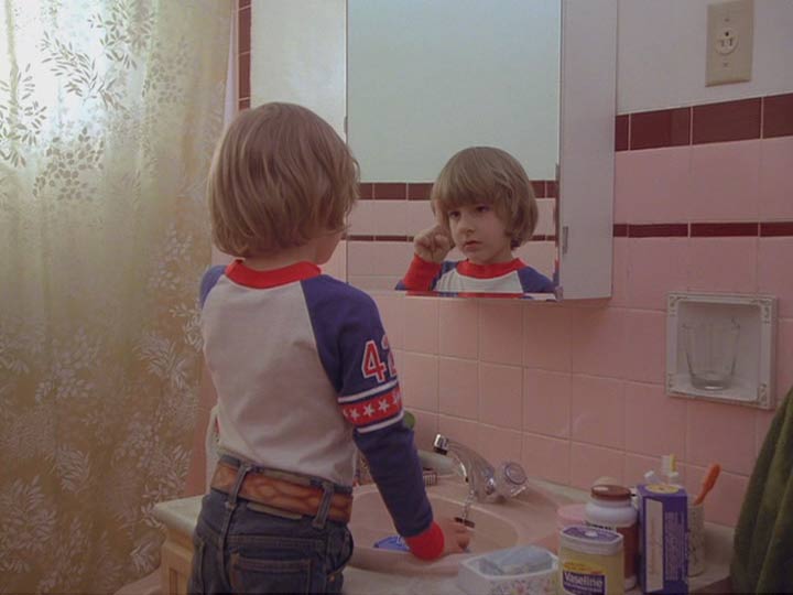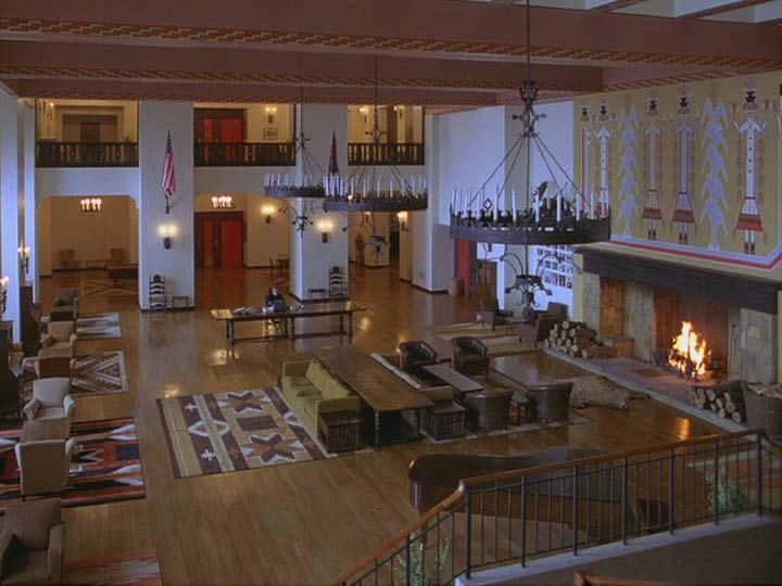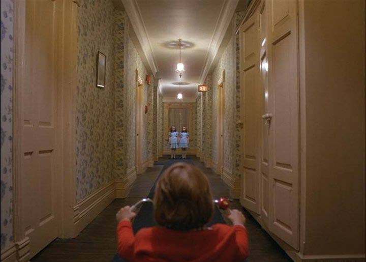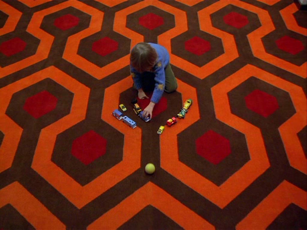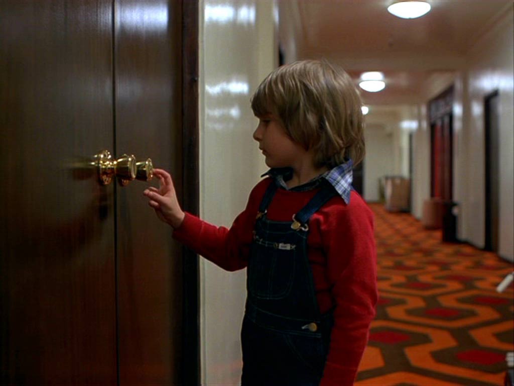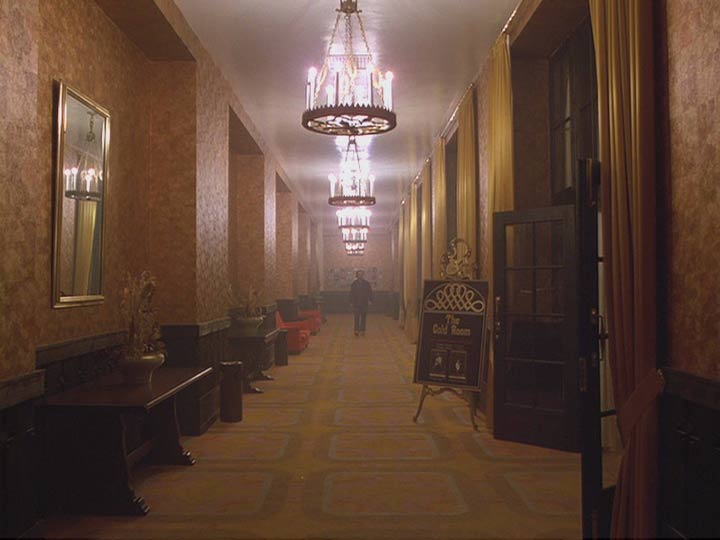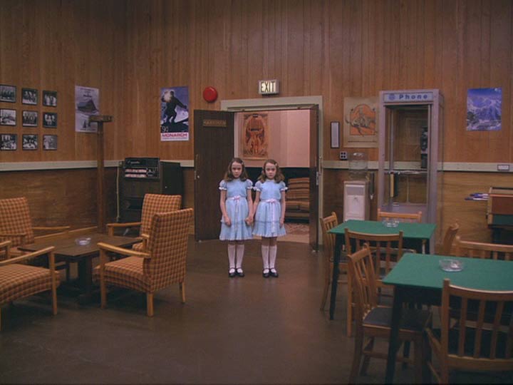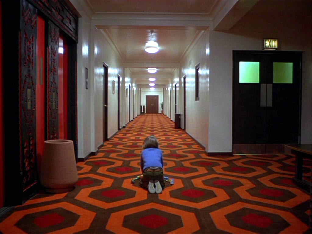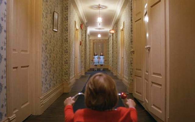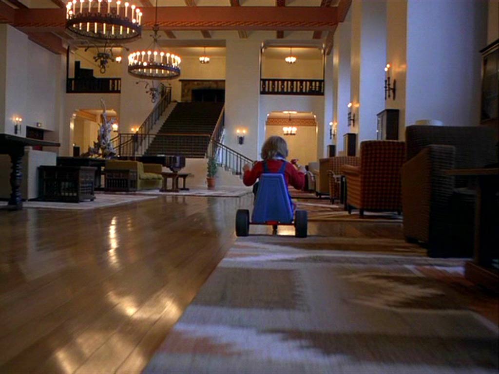Concreto y dimensionable entonces en primer lugar, tan aparentemente real como el patio de “La Ventana Indiscreta” (ese maravilloso exterior que es un realidad un gran interior rodeado además de pequeños interiores), la cámara en Steadicam se mueve en El Resplandor en manos de su inventor y operador Garret Brown, fluída e ininterrumpidamente por casi todos sus espacios. Siguiendo a Danny en su inmortal triciclo por las habitaciones y pasillos del hotel, a Wendy en el apartado oculto donde viven los funcionarios, a la misma Wendy y Danny (primero juntos y luego al niño separado de su madre y perseguido por el cariñoso padre) en el laberinto exterior. Conectando siempre los pasillos –del gigantesco set en Elstree Studios, Londres- al girar continuamente en las esquinas. Curvas sin trucos, espacios realmente próximos. Desplazándose después a lo largo de la cocina, el hall y todas las habitaciones abiertas y asomándose a algunas prohibidas del Hotel. Travellings laterales y planos picados desde lo alto de espacios enormes, como el lugar donde Torrance es un ser minúsculo intentando escribir en una larga mesa, se suman a la perfecta simetría con que se encuadran muchos de los interiores. Este lenguaje busca que nosotros construyamos en nuestra cabeza la hipótesis que fije las dimensiones y distancias reales entre todos estos espacios. Un mapa, un plano. Un recorrido constante en el cine, donde la arquitectura del set imita a la realidad, mezclando decenas de referentes de hoteles reales (visitados por el equipo de arte y los locacionistas) y que terminan fusionados en uno sólo, un hotel ficticio. El Resplandor goza de estos elementos gracias al impecable diseño de producción de Roy Walker (Ojos Bien Cerrados, El Talentoso Sr.Ripley), la dirección de arte de Leslie Tomkins (Charlie y la Fábrica de Chocolates, El Jinete sin Cabeza, Juez Dredd) y el trabajo del cinematógrafo John Alcott, frecuente colaborador de Kubrick en películas previas como La Naranja Mecánica y Barry Lyndon.