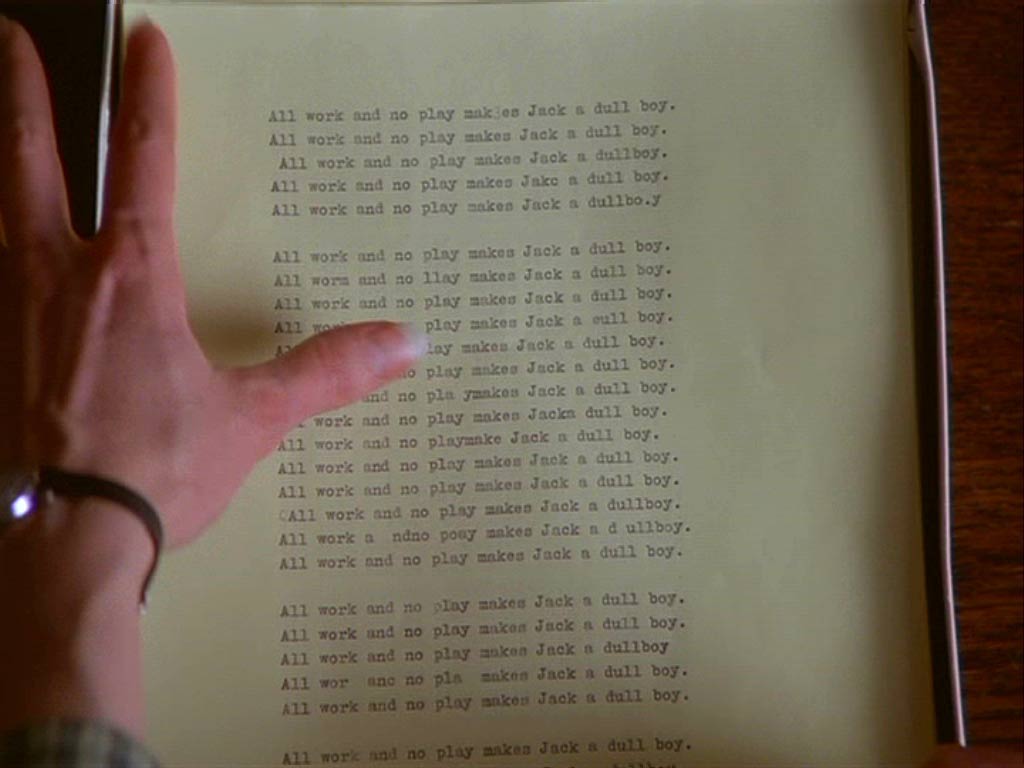 Kubrick toma la novela del mismo nombre del escritor Stephen King –quizás la fuente más bastarda y pop que el genio cinematográfico haya adaptado al cine- y la convierte en “una obra maestra contemporánea del horror”. Frase que de forma acertada y como muy escasamente pasa, la publicidad de esta película difundía. King, el rey del best seller del suspenso paranormal, es un experto en el tema de los escritores deprimidos enfrentados a diferentes horrores. Como otro de sus personajes, el escritor de best sellers secuestrado por su «fan nº1», el sorprendido Paul Sheldon (James Caan) en Misery (1990, Rob Reiner), o “El Escritor” (Richard Dreyfuss) en Cuenta Conmigo (Stand by me, 1986, también de Rob Reiner), esta última con su historia de dos muertes: la de un viejo amigo de infancia y la de un joven desaparecido muchos años atrás, al que él y sus pequeños amigos viajaron en su búsqueda. Esto fue algo que hizo que el mismo King fuera estupendamente pseudo parodiado en la demencial “Al Borde la Locura” (In the mouth of madness, 1994, John Carpenter) donde el escritor Sutter Cane (Jürgen Prochnow) no es otro que el alter ego de King en un mundo apocalíptico provocado por los mismo fanáticos de Trent y el infaltable demonio.