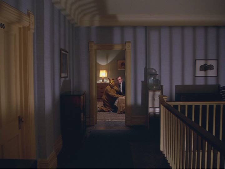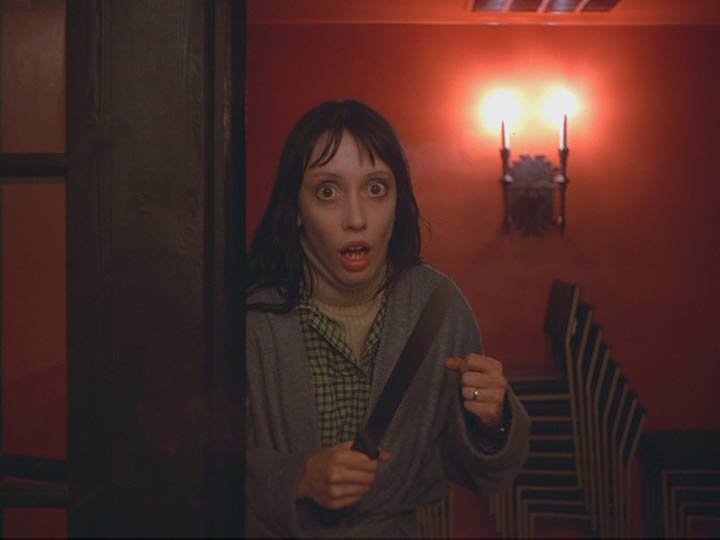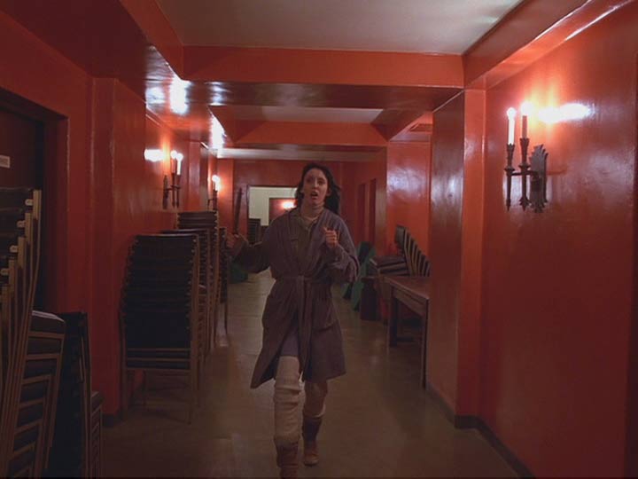 En segundo lugar, es fundamental para este terror que proviene desde el interior de los personajes y de los espacios que, como en la Casa Bates de Psicosis, en su sótano y habitaciones oscuras y macabras -como aquella del cuento de Barba Azul- el espacio debe ser también vasto y desconocido, independiente de que podamos medirlo –sí, ingenuos nosotros- desde afuera. Al hacer las plantas y cortes del Hotel Overlook, que postearé en el futuro en un artículo bastante más largo, existen varias inconsistencias intencionales en los espacios que nos llevan a desconectar varios de sus interiores. A confundir las uniones entre ellos y construir nosotros mismos mientras enfrentamos nuestro propio miedo inducido por Kubrick, nada será más sólido que nuestra propia imaginación para crear estas extrañas conexiones imposibles. Hacia el final de la película, una sucesión no arbitraria de espacios se nos presenta rápidamente cuando el caos ya está desatado, cuando las visiones son recurrentes incluso para Wendy, la última en hacerse parte de la locura colectiva/invasión espiritual. Algunos luagres que Kubrik se había reservado y que nunca habíamos visto previamente, como el pasillo rojo donde Wendy corre (¿pero como llegó ahí?) o la escalera en la sección donde se hospeda (¿dónde está?), donde ella observa espantada y al pasar frente a una puerta abierta a un hombre mayor vestido de etiqueta, sobre una cama y a otro hombre disfrazado de animal junto a él en un acto sorprendente. ¿Quiénes son?. Si hay algo que el director de 2001: Odisea del Espacio sabe muy bien es que hay misterios que la audiencia puede o no interpretar, y otros que es mejor no saber. Por algo las preguntas y el terror están, como en la belleza, en el ojo del que mira… y en tu interior.
