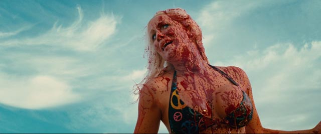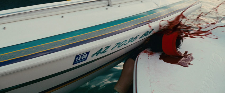 Piraña 3D, más que uno más en esa lista, es uno de los ejemplos más desfachatados de esos ejemplos anti neuronales que he visto en el último tiempo y que busca -y logra en algunas partes- entrar además en esa viscosa categoría llamada «placer culpable», riendo frente a la yuxtaposición brutal de sexo y violencia que recuerda al Cine B, a ese Australiano de los 70’s y 80’s. Con la lógica de ¿qué podría ser más atractivo para un adolescente que ver un desfile de bikinis, senos, escenas lésbicas, motos de agua, yates y veloces pirañas carnívoras comiendo y destruyendo todo lo anterior?, Piraña 3D buscar cumplir cada una de sus básicas, primitivas promesas. Y sí, lo hace. En un momento donde el Hollywood mainstream se ha caracterizado por un conservadurismo extremo (la reprimida saga de Crepúsculo, fábula de abstención sexual, es el primer ejemplo que se me ocurre) y que hace de una escena en topless o un desnudo frontal de un personaje un hecho muy, muy extraño en el cine de esa industria, descontando al cine Independiente cada vez menos Independiente, en Piraña 3D hay, sorprendentemente, un verdadero festival de carne. Y mucha: sensual, desnuda, sexual, violentamente mordisqueda, mutilada, sangrante, cruda, podrida, plástica, algo genérica, y aveces una que nos deja un poco indiferentes. Cómo mueres es aquí siempre mucho más interesante que quién eres, o mejor dicho eras antes de ser degullido.