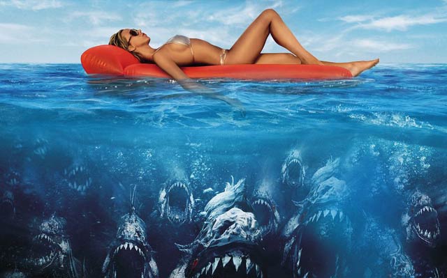 They’re here, they’ re hungry decía el slogan de Piraña (1978, Joe Dante), la película que nació tres años después de Tiburón como su bastardo hijo, interesado en comer un poco de la torta del éxito comercial de su padre. Como tal, Piraña 3D (que no vi en 3D, gracias a Dios) es la evolución natural, aunque más sincera y extrovertida, del revival del terror convertido en un tipo de cuasi pornografía comercialmente lucrativa (las series Hostel y Saw por ejemplo) de los últimos años. Una película que como mencionaba más arriba, si bien es ligera de ropas mantiene dentro de sí misma ese codigo moralista asesino, traicionero y un poco subterfugio que veíamos aplicado durante los 80’s en películas como la saga slasher de “Viernes 13” o «Pesadilla en Elm Street» en que sabemos perfectamente quien va a morir y quien va a salvarse. Les dejo la pregunta: ¿quién se salva de las pirañas, el virginal hombre adolescente y la casi inocente chica next door de sus sueños, o el productor porno y sus dos bellas súcubos bisexuales?. Mi compañero de clases se levanta entusiasmado para responder, pero suena la campana.