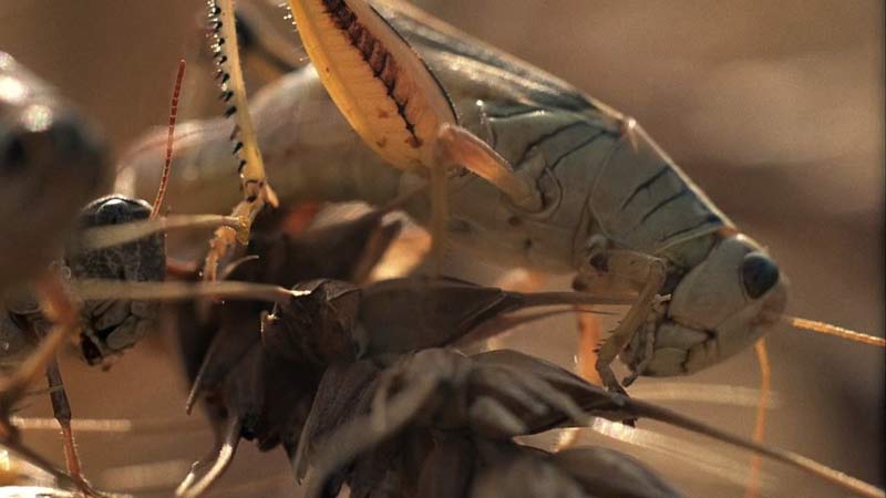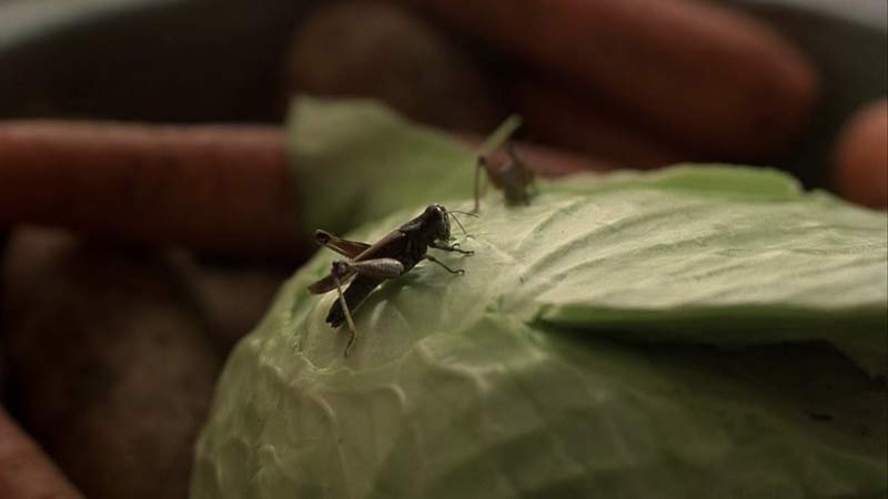 Porque esa nube de langostas comienza de a poco, con uno o dos insectos carcomiendo una espiga. Lentamente…y mientras eso ocurre, cuando ya casi se acaba “la hora mágica”, los últimos rayos del sol le pegan de lado a una vieja casa de madera en la mitad de la nada.