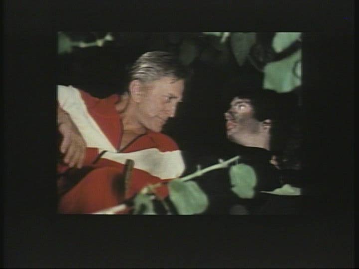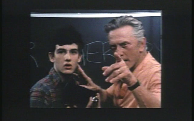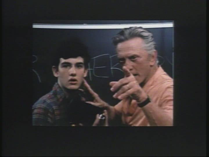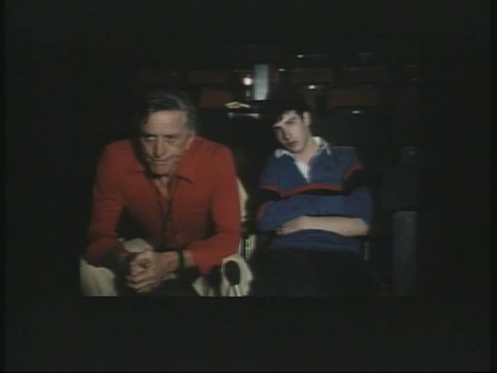 «El Maestro» (Kirk Douglas) ve la película de Denis (Keith Gordon). No está muy buena.