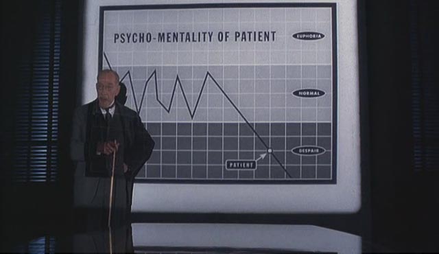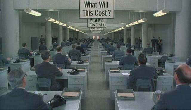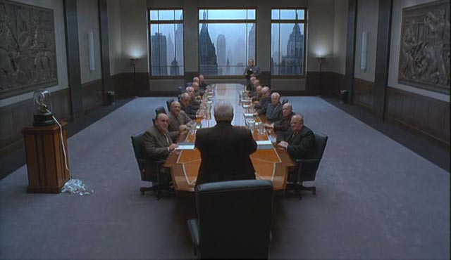 Como en “Brazil” de Terry Gilliam diez años antes, o “Tiempos Modernos” de Charles Chaplin en 1936, “Hudsucker” nos fascina con una delirante secuencia donde Norville trabaja como un engranaje más de una máquina mounstrousa, en el interior del edificio. En las oficinas internas de correo de Hudsucker las personas son laboriosas y desesperadas hormigas, y cuando las sirenas se prenden, las máquinas exudan humos, luces, señales y todos ponen pies en polvorosa: ¡es que ha llegado un importantísimo y temido sobre azul!. El destino se ha encargado de que Norville sea quien debe entregar este temido papel de forma personal –e intransferible- en las manos del segundo al mando de Hudsucker, luego del mencionado suicido del fundador. Esta mano derecha es el ambicioso y cruel Sidney J.Mussburger (Paul Newman).