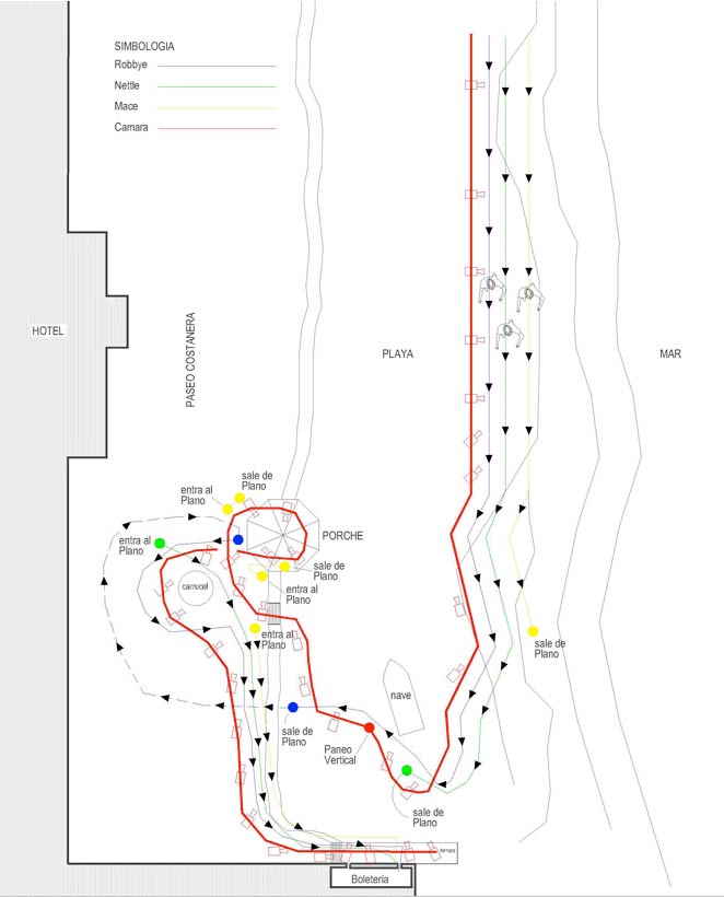 Corre la secuencia y con esta, un recorrido lineal en un plano horizontal que recorre paralelo a una especie de muro humano compuesto por soldados que forman una hilera, luego lo sigue una serie de obstáculos que los conforman pequeños elementos dentro del espacio abierto, que son rodeados por soldados, como son camiones, latas de gasolina, quitasoles, armamento, animales, una embarcación. Todos estos artefactos los usuarios los van adecuando a sus necesidades, configurando nodos, que van articulando el recorrido, creando verdaderas micro redes. Un verdadero laberinto humano surrealista, un recorrido por un orden no especifico, mejor dicho un concreto caos, siempre acompañado en un segundo plano por el horizonte homogéneo, que marca el límite playa /mar.