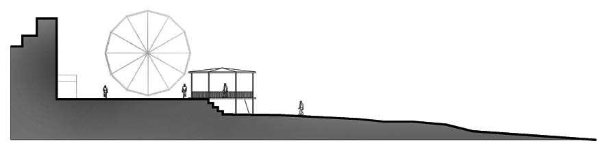 A continuación de esta escena, emerger un panorama urbano (sky line) donde se marca un contrates entre playa v/s ciudad, lleno y vacío, comienza aparecer edificaciones o mejor dicho ruinas de estas, de lo que queda encontramos un porche, un kiosco, aquí reconocemos un punto de encuentro, una jerarquía, donde los individuos se cobijan para hacer sus rituales religiosos, lo podríamos identificar como un lugar de oración. En este espacio podríamos aventurar que produce el nexo, la unión playa/calle, aquí se produce un cambio de nivel, con una pequeña pendiente, la cual se configura como límite. Al introducirse en la ciudad o en lo poco que quedaba de esta, cambia el contexto, pero sigue siendo un caos, pero se distinguen las proporciones de la ciudad, en relación al individuo.