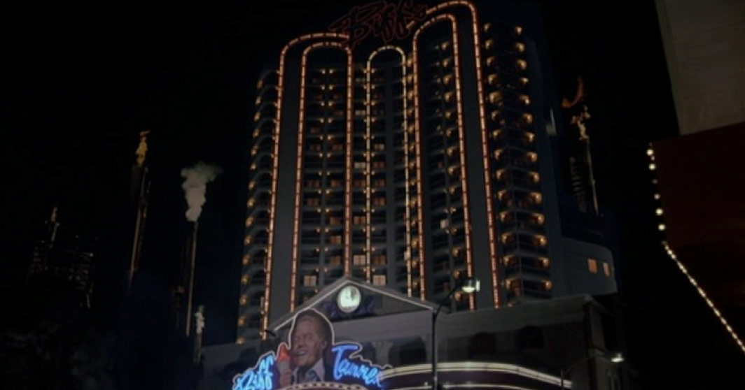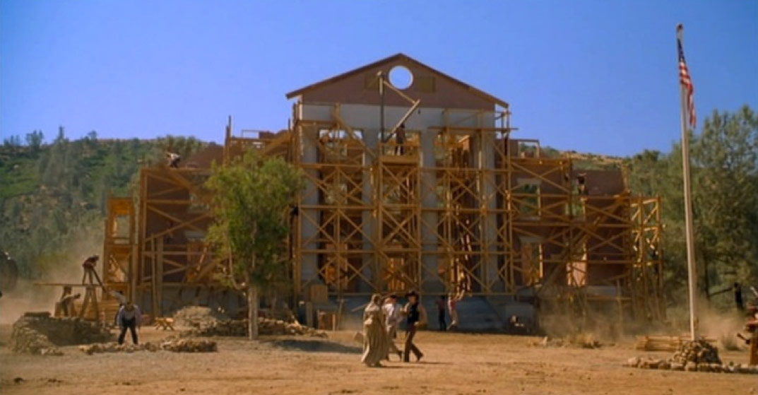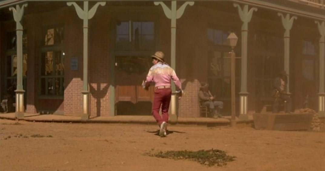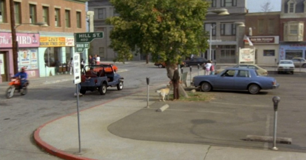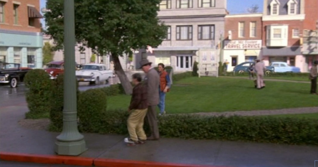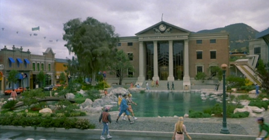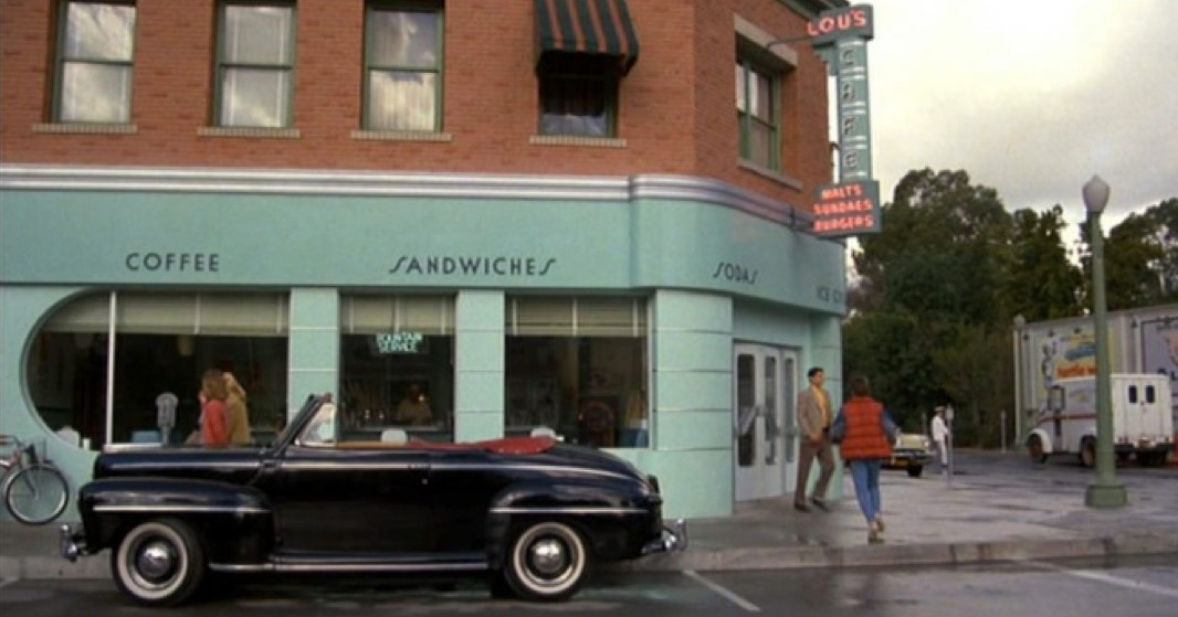 Volviendo a Hill Valley, frente a esta plaza/estacionamiento/laguna encontramos otra construcción que juega un papel importante en la película. En el año 1885 Hill Valley es un típico pueblo del far west, el Palacio de Justicia está siendo construido, pero hay varias secuencias que se llevan a cabo en el “Palace Saloon”, un bar clásico como el que podemos ver en cualquier película de vaqueros. En 1955, este local es “Lou’s Café”, una cafetería de la época donde también pasan cosas relevantes para la historia. En 1985 ya no es cafetería, sino que ha sido transformada en una suerte de gimnasio, el “Lou’s Aerobic Fitness Center”. Y para el año 2015 es el “Café 80’s”, una cafetería temática de aquella década, como adivinando esa especie de reencantamiento por los años ochenta que estamos viviendo, al menos en Chile, en estos días. En las tres películas hay secuencias importantes que transcurren en estos lugares. De hecho, en los años 1955 y 2015 vemos la misma persecución que se inicia en la cafetería, tras un desafortunado encuentro de protagonista y antagonista. Este local comercial también nos ayuda a localizarnos geográficamente en el lugar, el centro de Hill Valley.