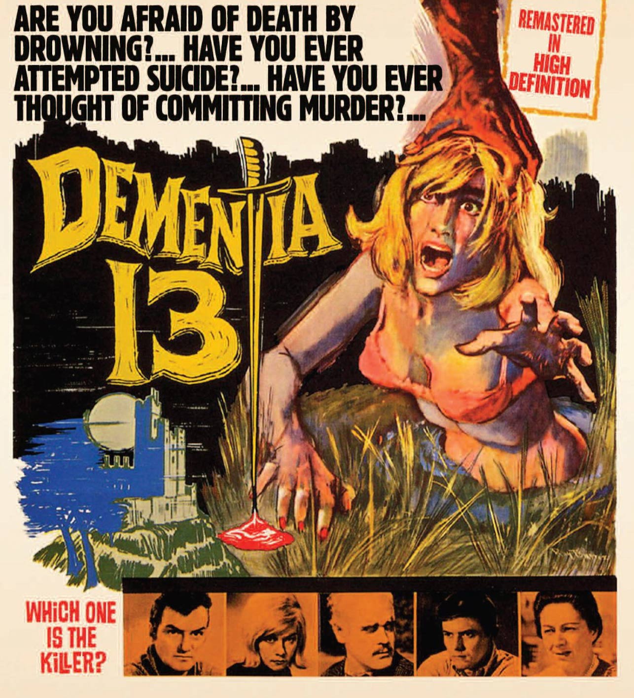 “Dementia 13” cuenta la historia, de forma directa y bastante precaria, de una ambiciosa mujer llamada Louise Haloran (Luana Anders). Louise acaba de perder a Richard (William Campbell), su insoportable marido, de un infarto mientras éste remaba un pequeño bote en el que navegaban sobre un lago, en una oscura noche, camino al castillo de la familia de su marido. Sí, hay gente que tiene castillos. Sabiendo que no podrá cobrar un peso de la herencia de la madre de Richard, si éste ya está muerto, manda el cadáver al fondo del lago y decide fingir que ella ha llegado sola, mientras el ocupado Richard está de viaje. Buscando como enloquecer rápidamente a la suegra –que simpática esta Louise- que ya se encuentra bastante perturbada por haber perdido hace varios años a su hija menor, muy pequeña, ahogada en el mismo lago, Louise husmea dentro  del castillo y prepara unas trampa. Pero lo que Louise no sabe es que alguien la está espiando a ella.