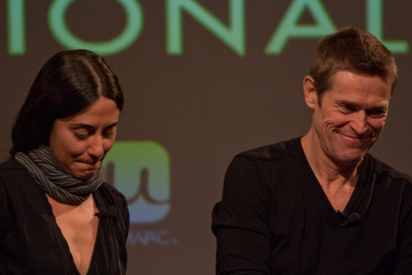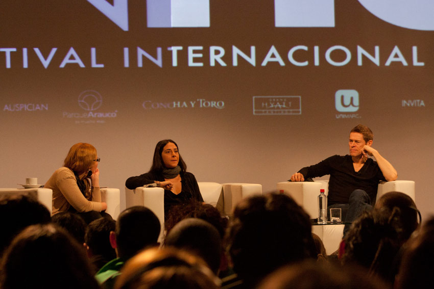 Mientras deliraba un poco en fiebre, decidí -a pesar de estar viviendo mi apocalipsis personal, rodeado de tapsines y papeles confort- ir al último encuentro internacional de SANFIC, el martes de la semana pasada, en el Hotel Hyatt. Giada Colagrande, actriz y directora italiana de video arte/documental, venía a presentar «A Woman» (2010) en el festival santiaguino, junto a su actor protagónico y esposo, el actor Willem Dafoe. Este último creo que no necesita mayor presentación, a menos que usted esté leyendo esto desde Marte -saludos!- o viva rodeado de osos grises en una lejana montaña, como en un documental de Herzog. Pero bueno, si usted está un poco perdido y le encuentra cara conocida, le cuento que es el actor de «Vivir y morir en L.A.», «La vida acuática», «Pelotón», «La última tentación de Cristo», «Corazón Salvaje», «eXistenZ», «La sombra del Vampiro» y claro, «Spiderman». Además, ha prestado su voz a películas como «Fantastic Mr.Fox» y «Buscando a Nemo», de PIXAR.