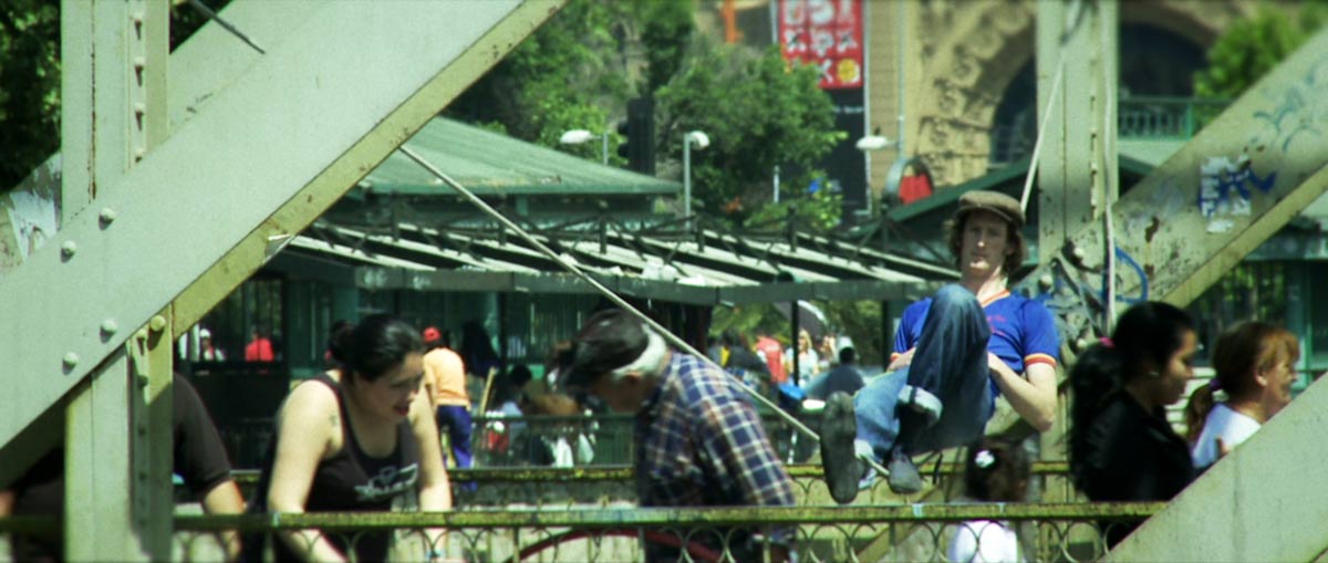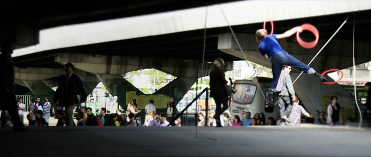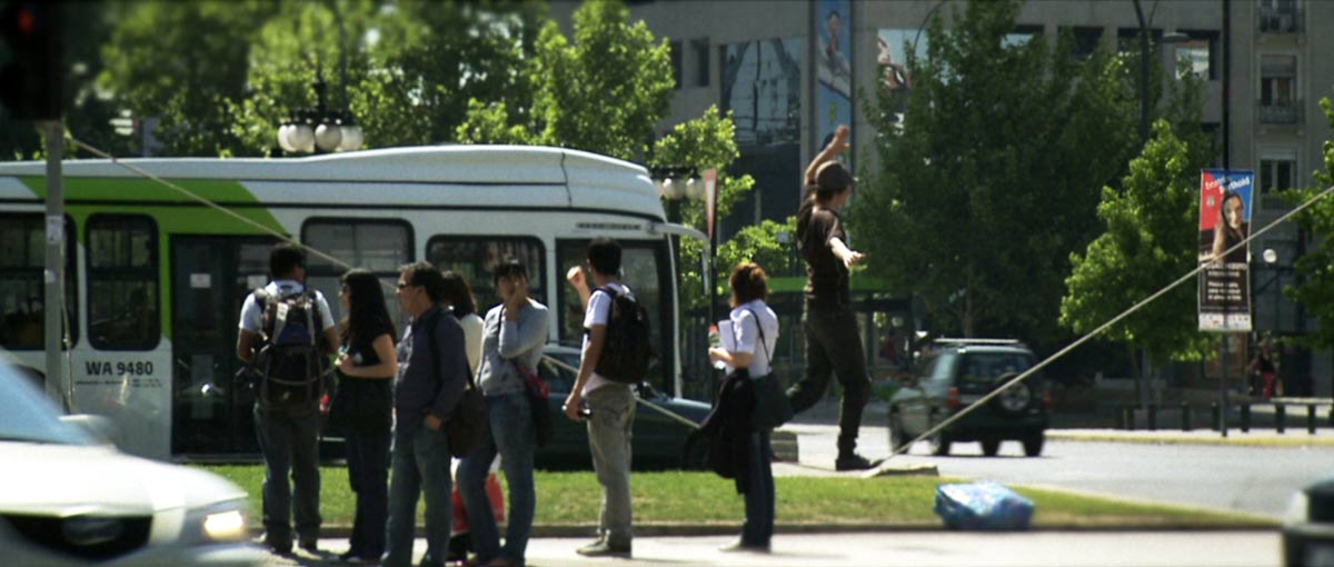Mira, la verdad es que Santiago para grabar es una ciudad bastante amistosa. En Londres por ejemplo, donde viví 2 años, no hubiésemos podido filmar lo que filmamos. Recuerdo que estando allá puse en una oportunidad un trípode en una estación de trenes y a los pocos segundos tenía 4 polis encima invitándome a guardar mis cosas. En España si no cortaba la calle o no armaba mucho jaleo quizás no me pedían el papel con el permiso del ayuntamiento. Pero aquí en Santiago, en la escena de Plaza Italia por ejemplo, hablamos con el Carabinero que dirigía el tránsito en la esquina y nos autorizó para colgar un rato la cuerda en la mitad de la calle. Por suerte que nadie chocó por nuestra culpa. Y cuando no teníamos permiso tampoco tardábamos tanto como para que nos vinieran a echar la verdad sea dicha. Solo un par de veces llegaron guardias a pedirnos que sacáramos la cuerda, y ahí pasaba algo bien curioso. La gente que se paraba a ver el espectáculo de Tito nos defendía y reclamaba al guardia argumentando que no estábamos haciendo nada malo. En el fondo querían seguir viendo a este flaco excéntrico arriesgar su vida, o al menos la integridad de unos cuantos huesos.