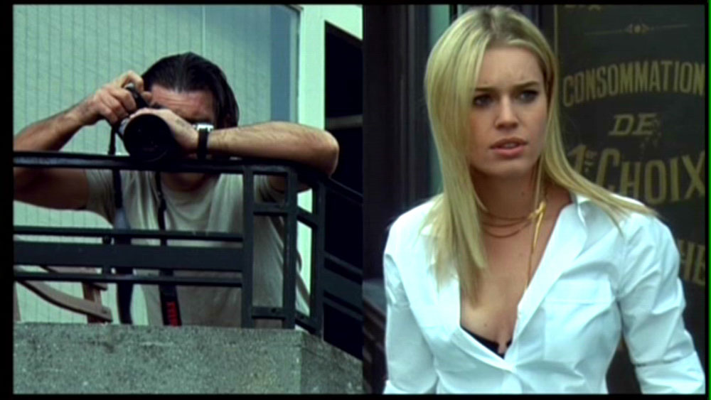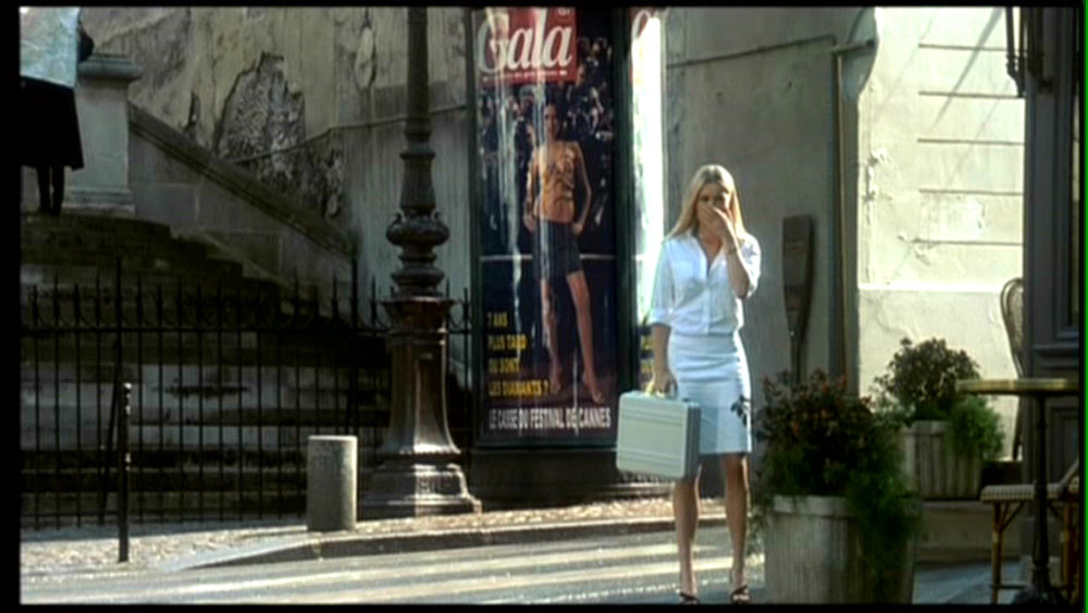 Para comprender las narrativas modulares presentes en Femme Fatale, debemos resumir primero su argumento, y con mayor detalle, el que se encuentra expuesto en sus primeros treinta minutos. Laure Ash (Rebbeca Romjin, la mujer que veía Double Indemnity al inicio del filme) junto a tres hombres -entre ellos el mencionado Black Tie- conspiran para robar los diamantes que cubren el cuerpo de una mujer que asiste a una exhibición en el Festival de Cannes 2001. Laure traiciona a su equipo, escapando con el botín y abandonando a Black Tie, malherido. Buscando un pasaporte para retornar a EE.UU., disfrazada de morena y radicada ahora en París, Laure es ayudada por una misteriosa mujer en una gran escalinata (que funciona como plaza) ubicada entre una antigua iglesia y un café, donde son fotografiadas por un paparazzi llamado Nicolas Bardo (Antonio Banderas). En el Hotel Sheraton, donde intentaba recoger el pasaporte fraudulento a través de un intermediario, Laure es lanzada al vacío desde lo alto de uno de sus pisos, por uno de los hombres que traicionó en Cannes y que la ha seguido hasta ahí, engañándola. Providencialmente salvada por una acumulación de un material blando en el primer piso, Laure es llevada a la casa de la desaparecida Lily (personificada por Rebecca Romjin, nuevamente), por los confundidos padres de esta segunda mujer.