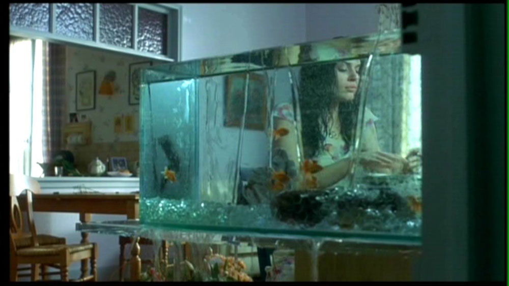 Los detalles que le permiten al espectador atento darse cuenta de que observa en realidad un sendero que se bifurca, como establece Cameron, e inventado completamente por Ash, nuestra dormida narradora, tienen que ver principalmente con la aparición constante del agua, como elemento clave. Pasando de la narración objetiva de los primeros veinte minutos del inicio del film –el notable robo durante la proyección de una película Cannes, el segundo largometraje dentro del largometraje Femme Fatale, después de Double Indemnity– y la caída desde el hotel, pasamos una historia completamente subjetiva, una vez que nuestra protagonista se duerme. Esta es la narración del inconsciente de Ash, dormida en el agua, desde una tina que se rebalsa, en una duración de tiempo que desconocemos, pero que no pueden ser más que unos minutos, antes de lo que le ocasionaría una muerte segura por ahogamiento. Desde entonces, en su falso despertar, el agua abunda: el suicidio de Lily ocurre mientras un acuario cerca de ella se rebalsa inexplicablemente –imitando a la tina-, cae la lluvia durante París durante gran parte del metraje y diferentes personajes vierten agua, desde jarras y botellas, frente a cámara; por ejemplo, mientras Ash sube al avión que la lleva a EE.UU, o mientras se nos narra el encuentro –inexistente- con el fotógrafo en un café, alguien vierte agua casi al margen del cuadro desde una jarra. Incluso, esto ocurre en situaciones donde ni siquiera ella está presente (como todas aquellas donde ella no aparece en el sueño. Es que Ash se convierte en narradora omnisciente en su sueño, donde por ejemplo, un policía llena ocho vasos de agua -¿para qué?- delante de la habitación de interrogación –que está, acotemos, en divertido código de film noir, con sombras de persianas en todas las paredes- y donde han detenido a un sospechoso Bardo.