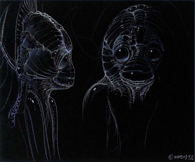 De una ambición y vehemencia ilimitada para tomar proyectos imposibles, con obras de ciencia ficción tan logradas como Terminator, Aliens, Terminator 2: El Juicio Final y la más reciente Avatar, Cameron hizo otra gran película en 1989 y se llama The Abyss (El Secreto del Abismo). Moebius vuelve entonces a las páginas de 35milímetros hoy con una cuarta galería de dibujos para el cine, con sus maravillosas ilustraciones conceptuales de los alienígenas que en el fondo del mar se ocultan y que se nos revelan sólo al final del largometraje de Cameron protagonizado por Ed Harris y Mary Elizabeth Mastrantonio. Extrañas figuras, similares a insectos gigantes.