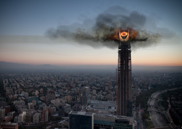 El excelente fotomontaje superior, con el maléfico ojo de Sauron en la cumbre de la Torre («el ojo que lo ve todo», el villano máximo de El Señor de los Anillos; eso, por si vivías en en una caverna entre los años 2000 y 2003 y no tienes idea de quién cresta es Frodo Baggins) apareció ayer en diferentes blogs -desconozco el autor, lamentablemente- y luego de subirlo al facebook de 35 milímetros, ya ha sido compartido por más de mil personas.