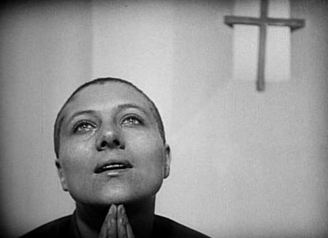 Por otro lado, la mártir de Dreyer, es una mujer dolida, tratada injustamente, que se mantiene firme a pesar de su tortura física y psicológica. Con primeros planos que realzan las expresiones faciales de los actores, el director nos sumerge en la dolencia de Renée Jeanne Falconetti, quien encarna una Juana de Arco amarrada a sus ideales espirituales, y sufrida por la falta de compasión e injusticia del tribunal que la acusa de hereje.