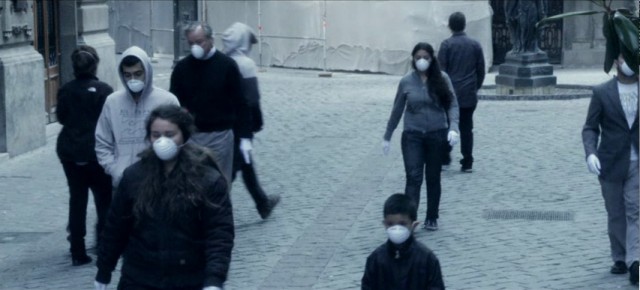 Eso funciona en los planos urbanos, por ejemplo, cuando muestras la ciudad, que es básicamente la calle Nueva York en el centro de Santiago: el gris, la monocromía, la contaminación, cosas que se apegan muy bien al Santiago que ya conocemos hoy. Incluso las personas que caminan con mascarillas, como en los días críticos en que hay más smog.